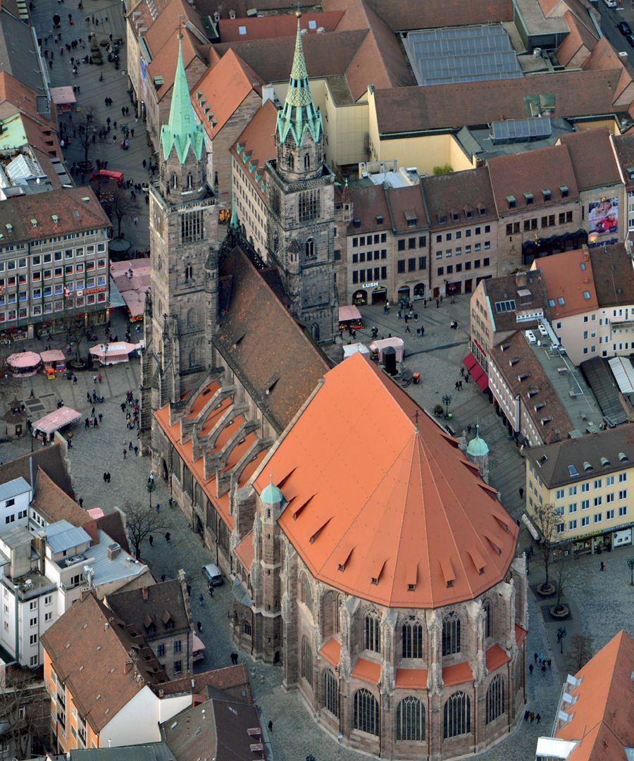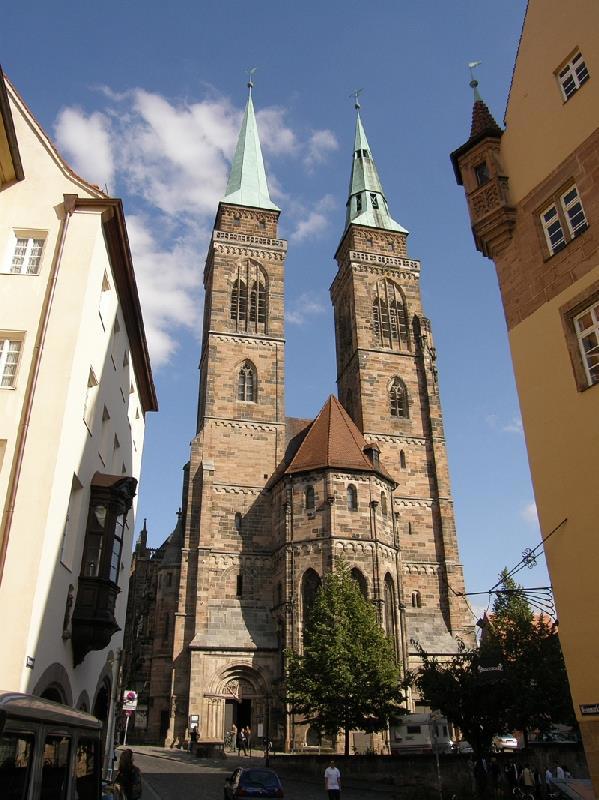 В тридцатых годах XIII века в Нюрнберге на северном берегу Пегница начали строить церковь в честь Святого Зебальда, отшельника, жившего на месте будущего города в VIII веке. А десять или пятнадцать лет спустя на южном берегу реки решили тоже построить церковь, такую же большую и красивую, но уже в честь Святого Лаврентия. Соперничество между разными частями города привело к тому, что эти храмы стали очень похожими. Их иногда даже называют градостроительным панданом. По именам этих церквей часть города к северу от реки называется Зебальд или "сторона Зебальда", а к югу от реки — Лоренц или "сторона Лоренца".