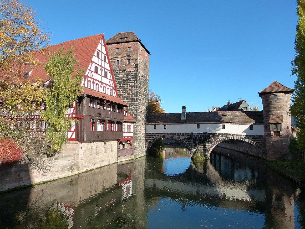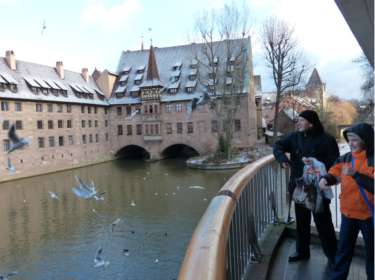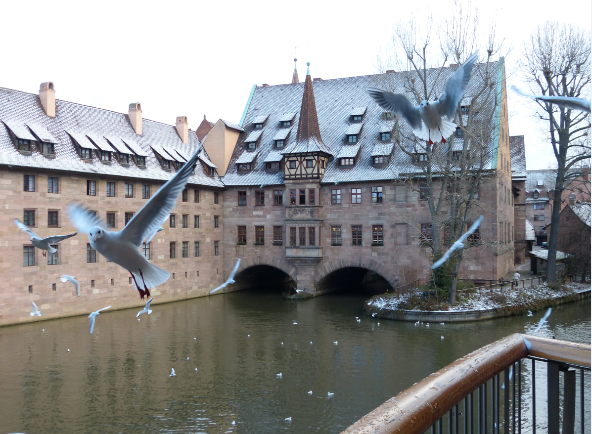 А ещё в Нюрнберге есть замечательный мост Museumsbrücke, с которого открывается прекрасный вид на Госпиталь Святого Духа. Если купить в булочной напротив хлеба, а потом выйти на этот мост или на ближайшую набережную кормить чаек, то можно получить массу положительных эмоций.