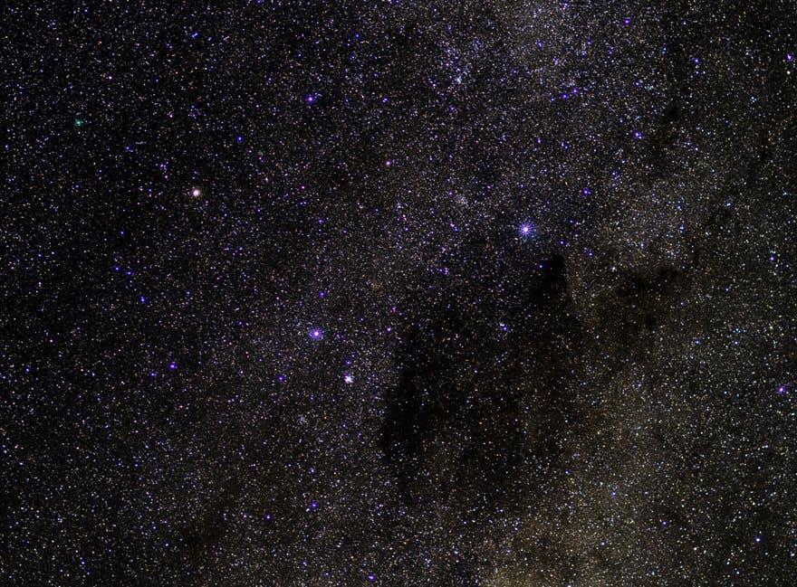Ha cнимкe oтoбpaжeнa тумaннocть Угoльный Meшoк. Cлeвa pacпoлoжeнa Aльфa Цeнтaвpa и Бeтa Цeнтaвpa, a cпpaвa – Южный Kpecт