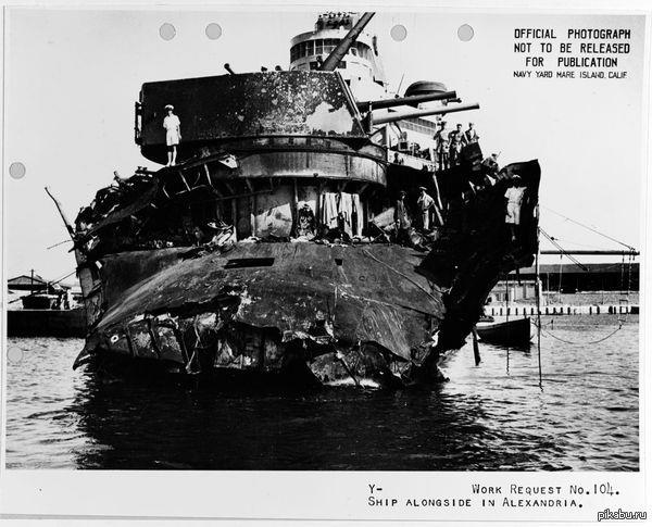Попадание торпеды, правда с самолета, у крейсера отломило нос.