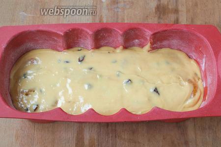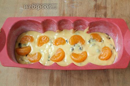 Тесто выливаем в форму частями, перекладывая мандаринами. Если форма силиконовая, то можно только присыпать её мукой, если металлическая или керамическая, то смазать сливочным маслом и также присыпать мукой.