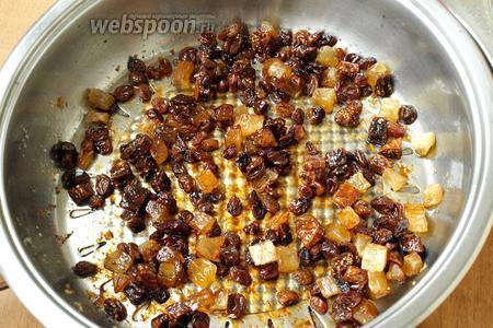 В эту же сковороду отправить сухофрукты вместе с коньяком и прогреть до испарения всего алкоголя. В качестве сухофруктов у меня были изюм, сушёный инжир и ананас. Сухофрукты также оставить остывать.
