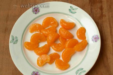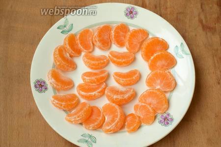 Мандарины очистить от шкурки, разделить на дольки и выложить на тарелку подсохнуть на 1 час.