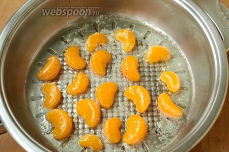 Спустя это время в сковороде разогреть 20 г сливочного масла, добавить 1 чайную ложку сахара и выложить мандариновые дольки. Жарить с каждой стороны по 2 минуты.