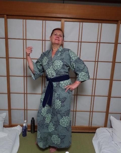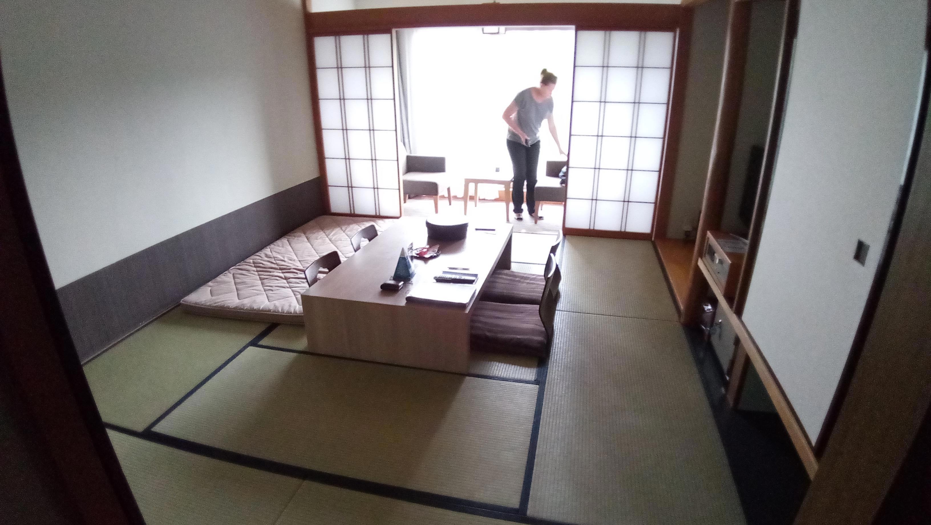 Отель моя супруга (она всегда все планирует в нашей семье) заказала традиционно японского стиля. Втутри все как и положено в Японии ходят в тапочках и домашних халатах (юката).
