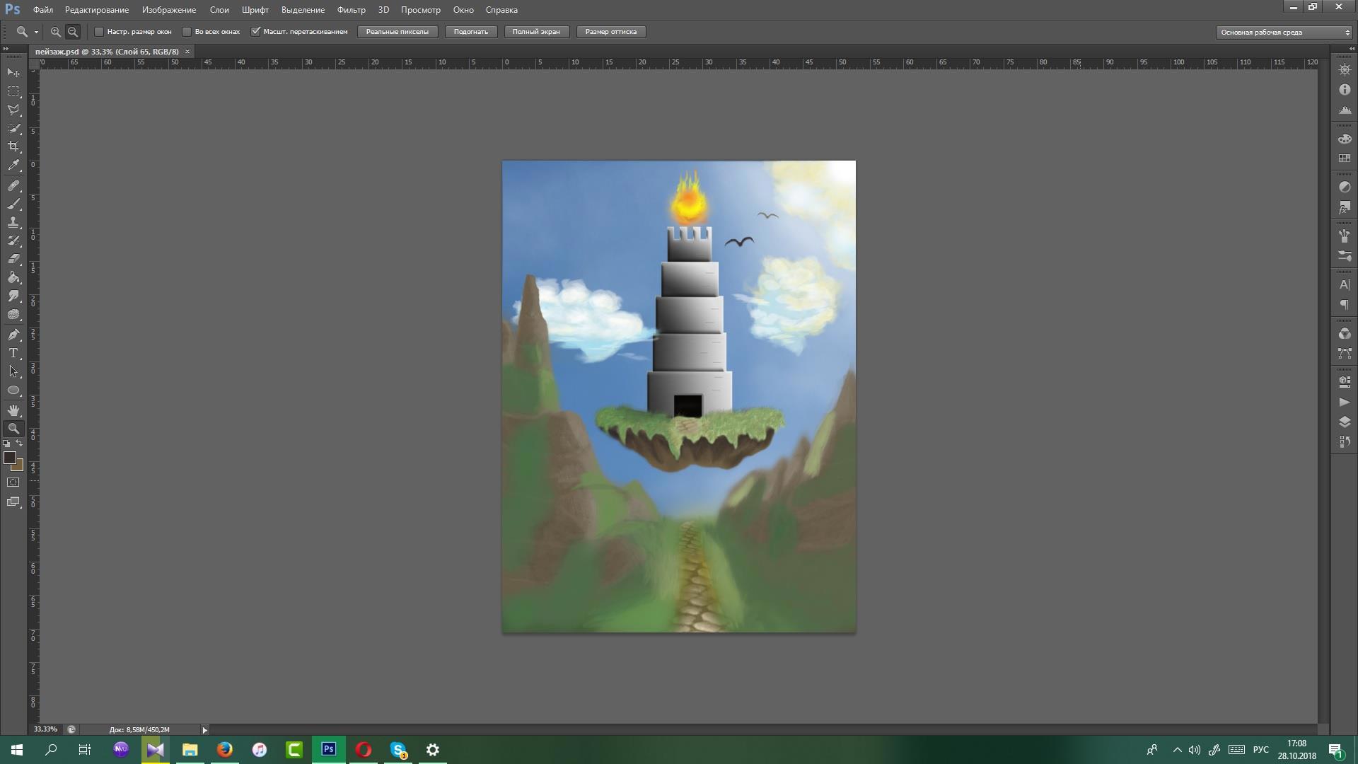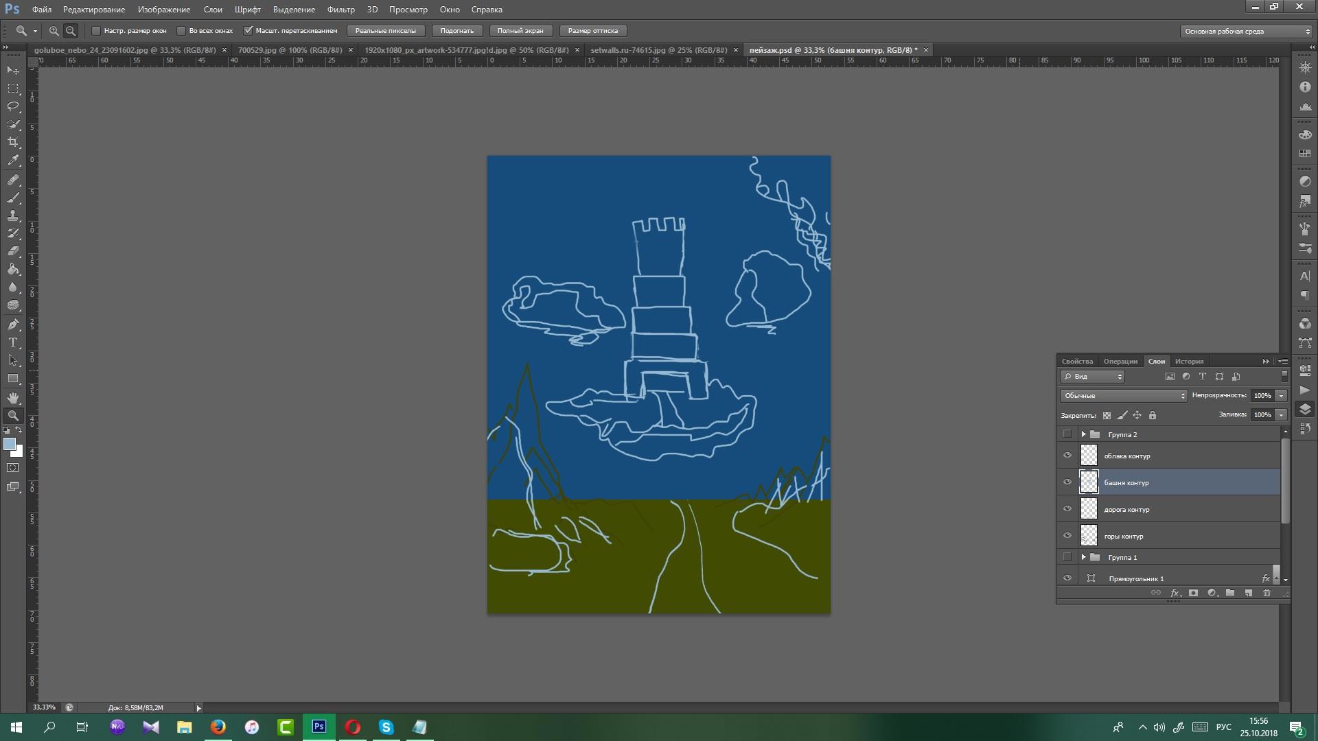 Этап 3: небо, горы, башня, о уже что-то вырисовывается
