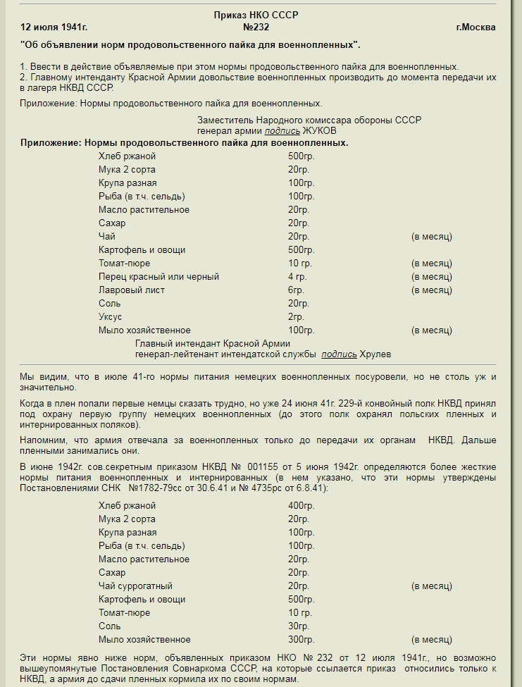 Для лучшего представления о нормах довольствия военнопленных гитлеровцев, предлагаю сравнить их с нормами РККА (https://author.today/post/221000), РККФ (https://author.today/post/227797), военнослужащих США и Англии (https://author.today/post/224558), и для полноты картины - военнослужащих Германии (https://author.today/post/224229).