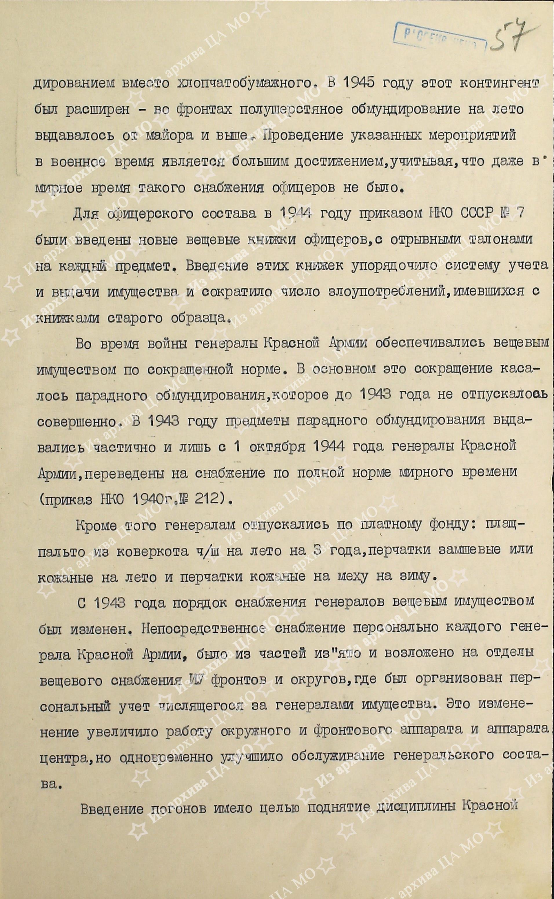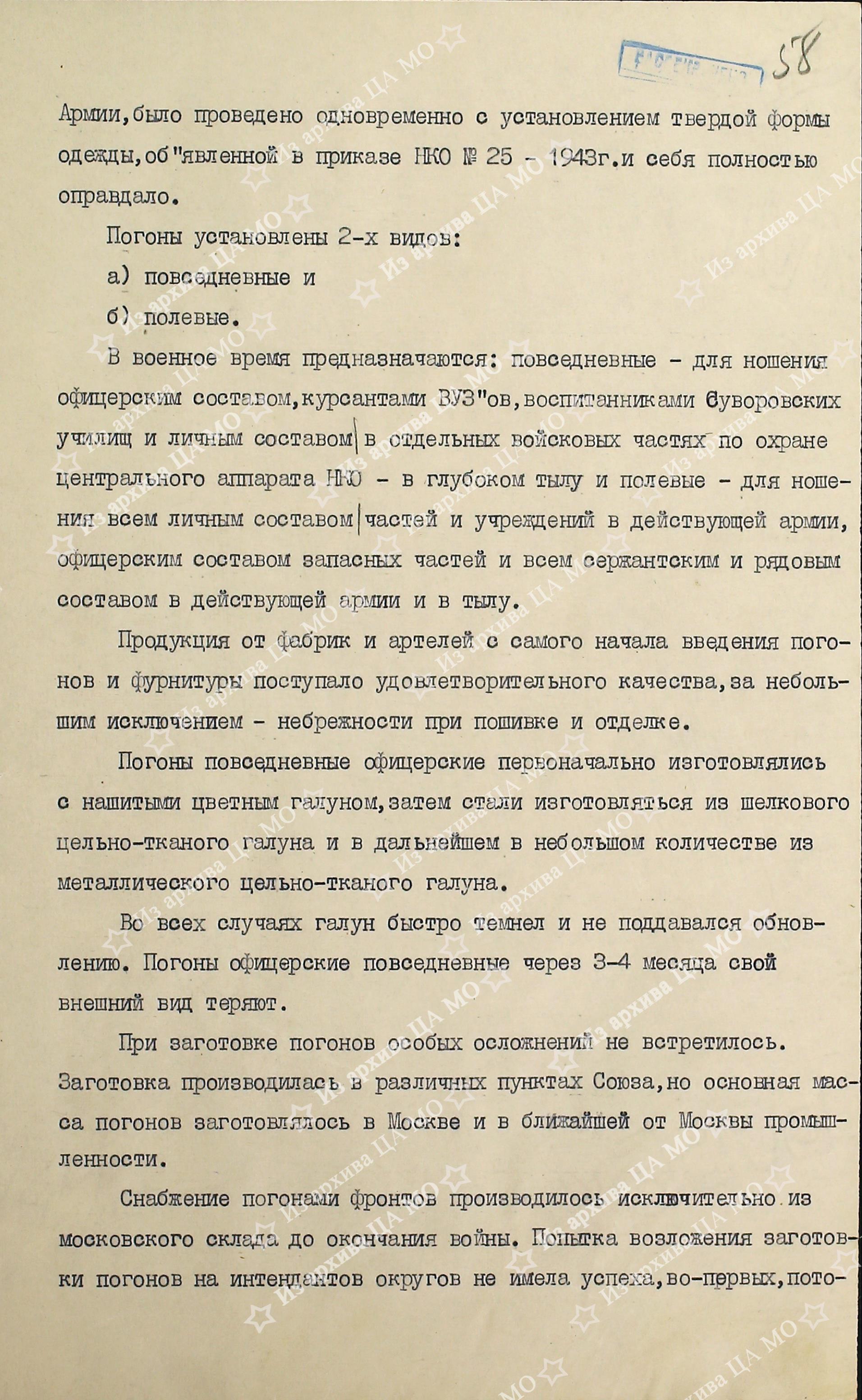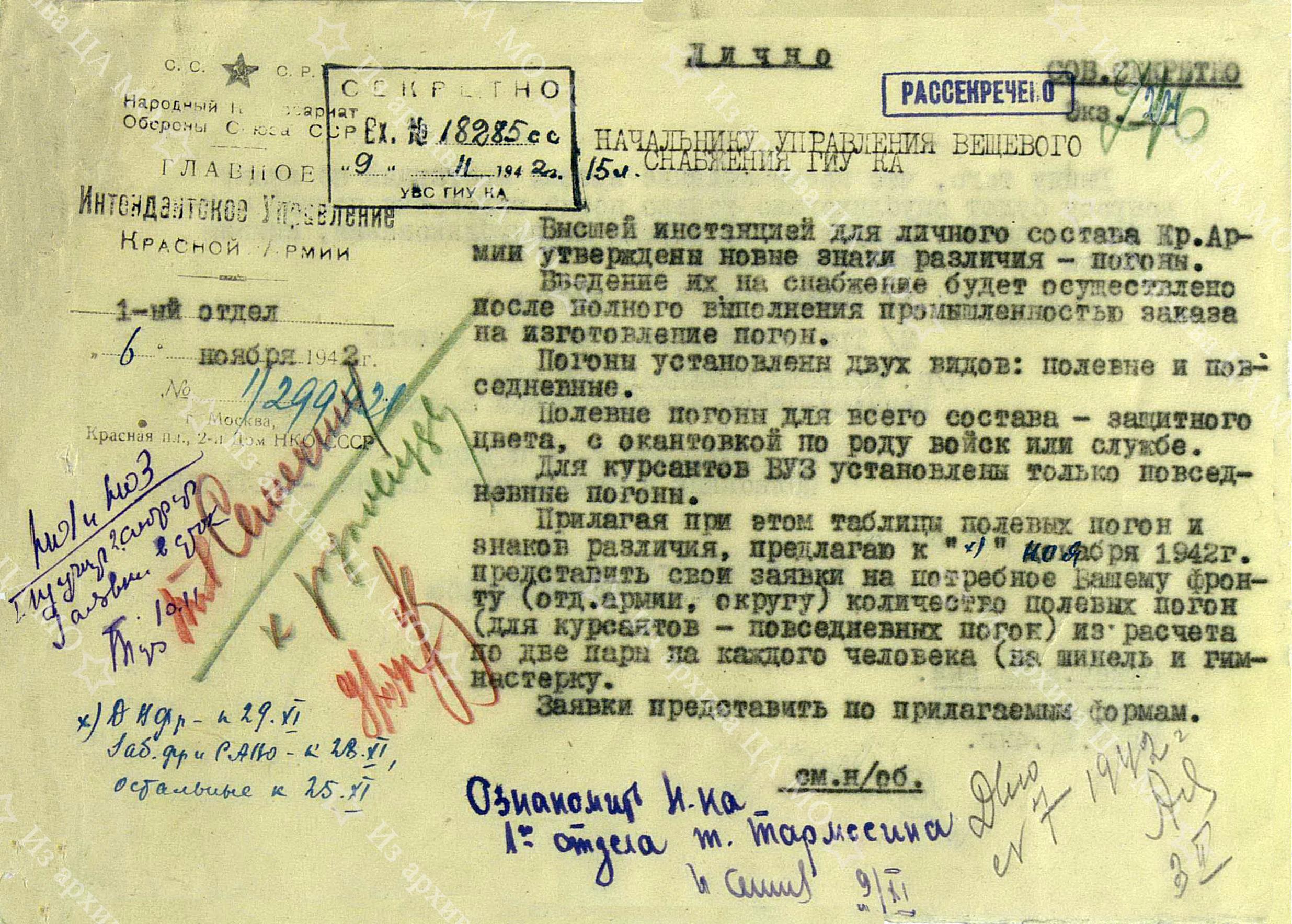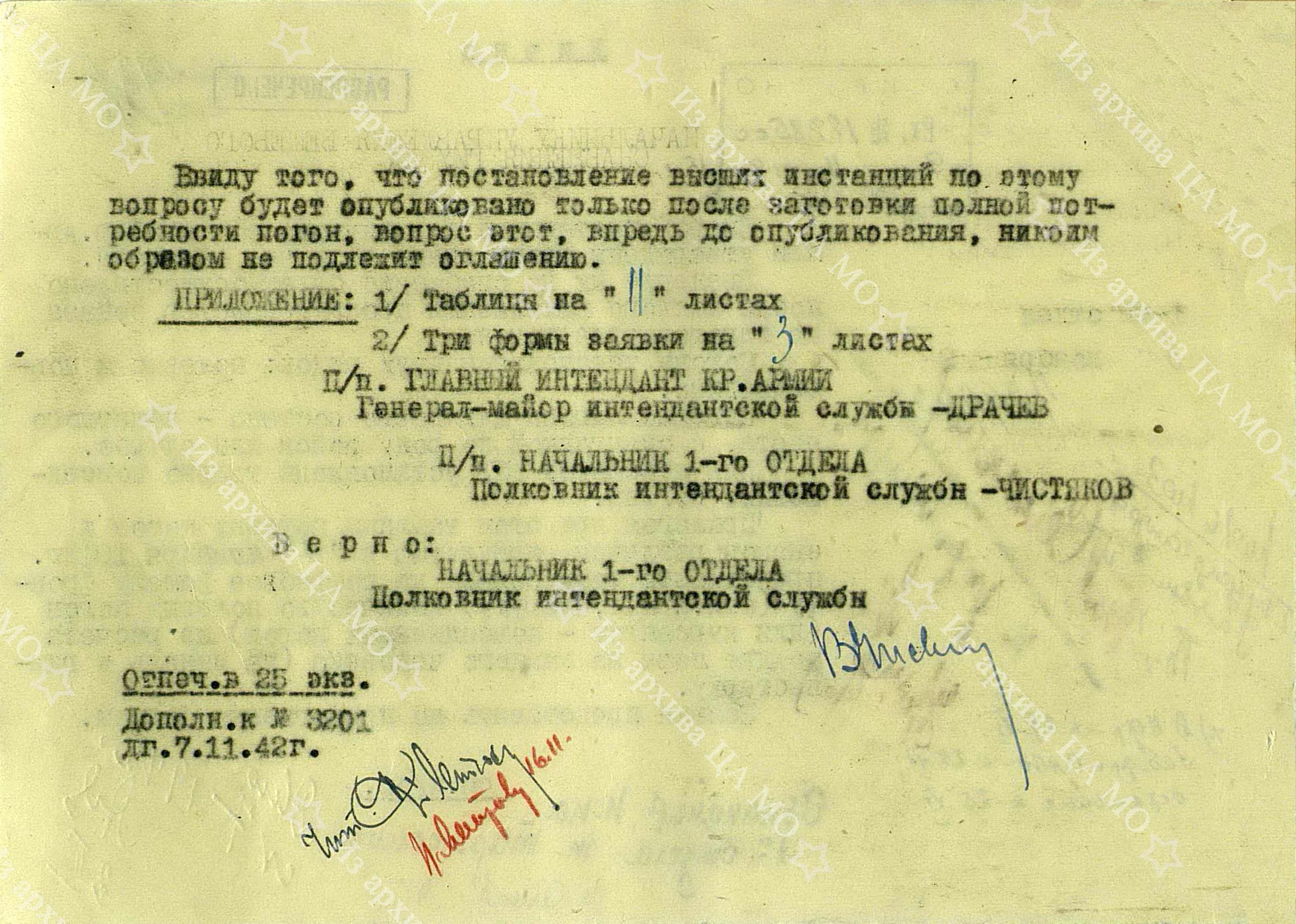 Благодаря помощи сотрудников Центрального архива МО РФ в нашем распоряжении оказался подписанный 6 ноября 1942 года Главным Интендантом Красной Армии генерал-майором П. И. Драчёвым циркуляр, который начинается со слов: «Высшей инстанцией для личного состава Красной Армии утверждены новые знаки различия – погоны. Введение их на снабжение будет осуществлено после полного выполнения промышленностью заказа на изготовление погон.»[1]. Скорее всего, в своём рассказе генерал армии А.В. Хрулев руководствовался записывавшему с его слов корреспонденту, следующими строками этого циркуляра «Ввиду того, что постановление высших инстанций по этому вопросу будет опубликовано только после заготовки полной потребности погон, вопрос этот, впредь до опубликования, никоим образом не подлежит оглашению.».