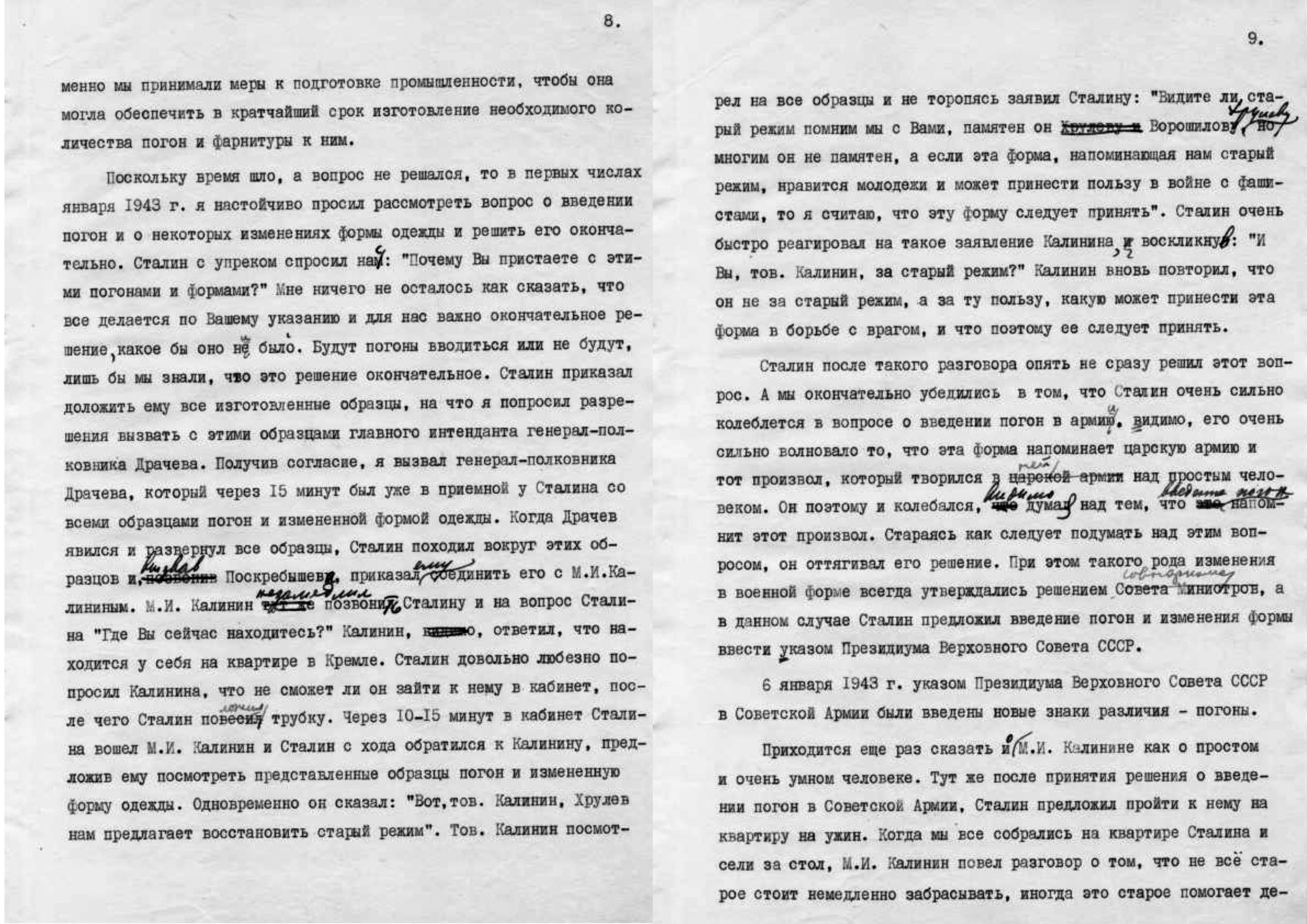 Я попросил разрешения вызвать главного интенданта генерал-полковника П. И. Драчёва. Через пятнадцать минут он был в Кремле. Когда он разложил в приёмной все образцы погон, Сталин походил вокруг них, посмотрел и, приказав соединить его с Калининым, попросил его зайти к нему. Минут через десять явился Калинин. Обращаясь к нему, Сталин шутливо сказал:
