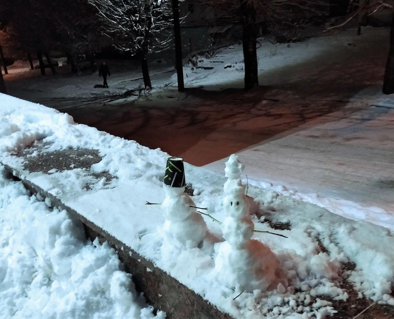 Снежные кавалер с дамой на парапете у магазина) У него шляпа из кофейного стаканчика, она - простоволосая: