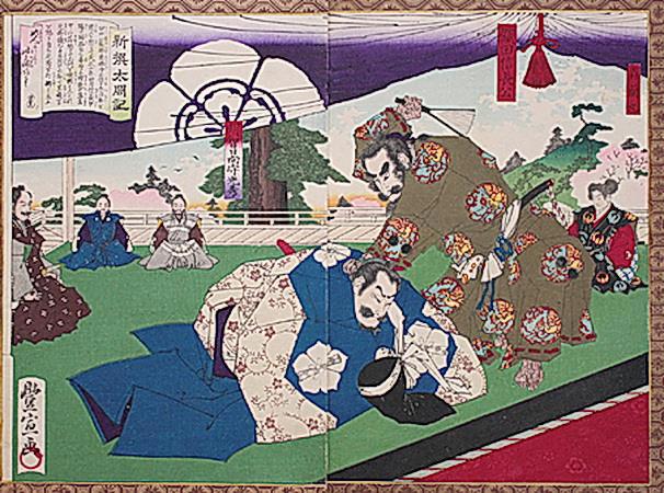 ...Здесь нарисовано, как Ода Нобунага  бьет веером Акэти Мицухидэ за то, что тот пишет бояръанимэ.