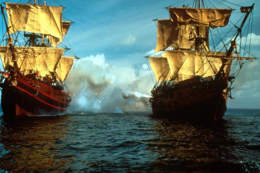 Мой пиратский корабль -- это, конечно же, "Арабелла", бывший "Синко Льягас". 40 пушечный фрегат Питера Блада. Перо вместо кисточки, что я использовал для акварели, позволило мне вырисовать самые мелкие детали, такелаж, орудийные порты и прочее. И клубы пушечного дыма...