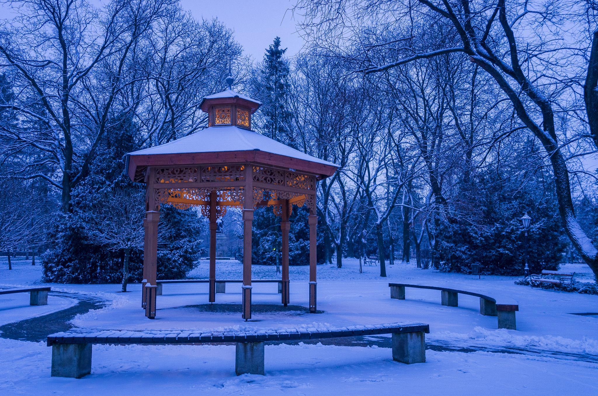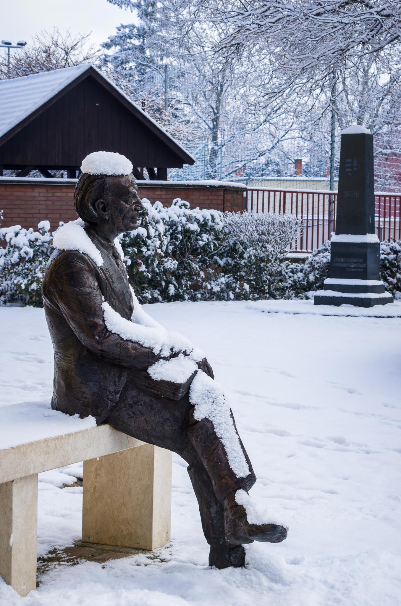 Бронзовый проповедник на лавочке возле протестантской церкви тоже прибарахлился: шапка новая, шарфик...
