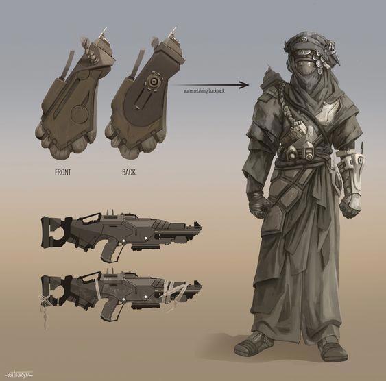 Арабы... вот тут я по креативил, так по креативил. Хотя нет, просто смешал всё в кучу. В отзывах, Сергей Кун правильно подметил их сходство с хаоситами-кхорнитами. Но при этом они ещё имеют черты ваховских орков - война ради войны. Не ради наживы, идеи или просто убийства, а именно войны. Поэтому взяв штурмом какую-нибудь колонию Европейской империи они не убивают женщин и детей. Не из-за гуманизма, а потому что если устроить врагу геноцид, то нцать лет спустя будет не с кем воевать. Но я ушёл от темы. В общем оснащение. Под тряпками скрывается обтягивающая униформа, очень похожая на дюновские дистикомбы (образца фильма 2021 года), только это не комбинезон, а вполне раздельно штаны, перчатки и рубаха. Ну и более прочный, ибо не выглядит, как резина. Шлемы, если их можно так назвать, представляют собой обтекаемую, черепоподобную форму. А на уровне глаз - линзы, как у хеллгастов из Килзоны. Всё это укутано в тряпки, что делает арабов эстетически похожими не столько на самих себя в реале, сколько на харадримов из экранизации Властелина Колец (только песочного цвета, а не красно-чёрного). Короче смешались в кучу кони-люди.)))) Повторюсь арты лишь приблизительные.