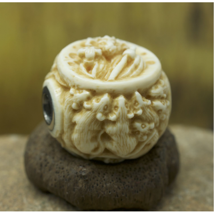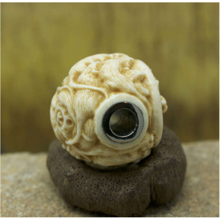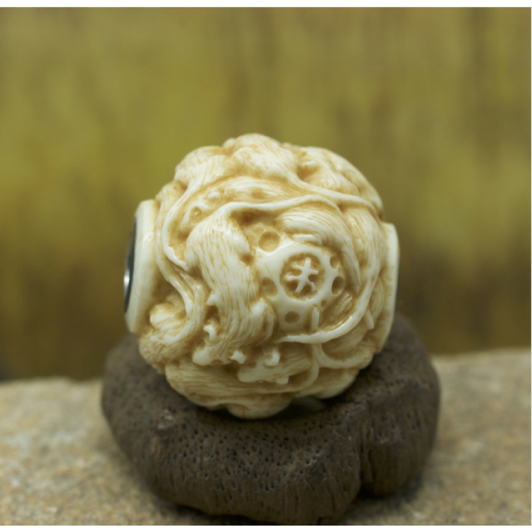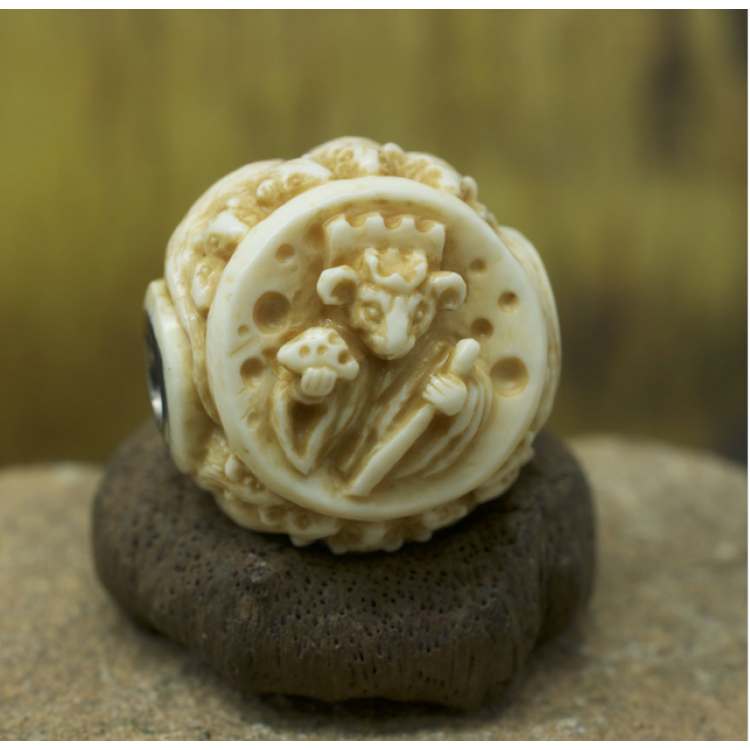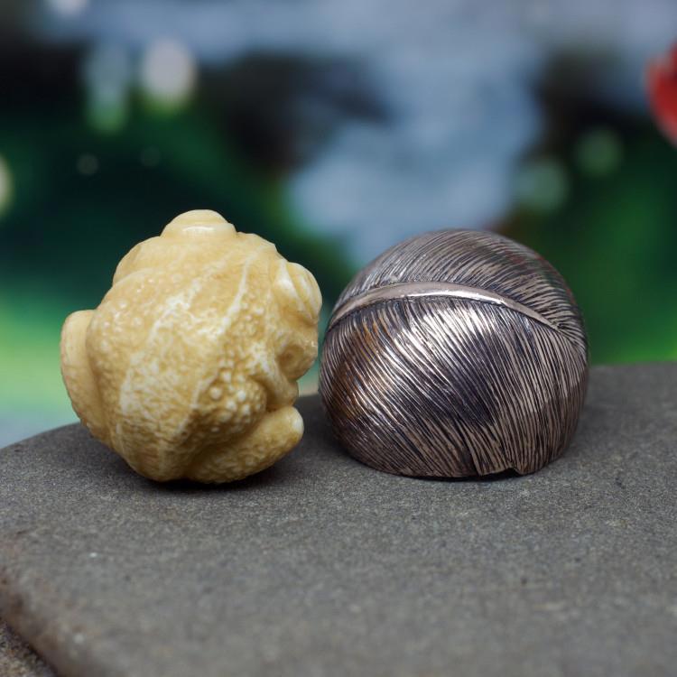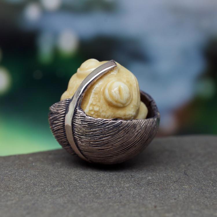 Это большая и тяжёлая нэцке в формате бусины-одзимэ, вырезана из зуба кашалота со вставками серебра.