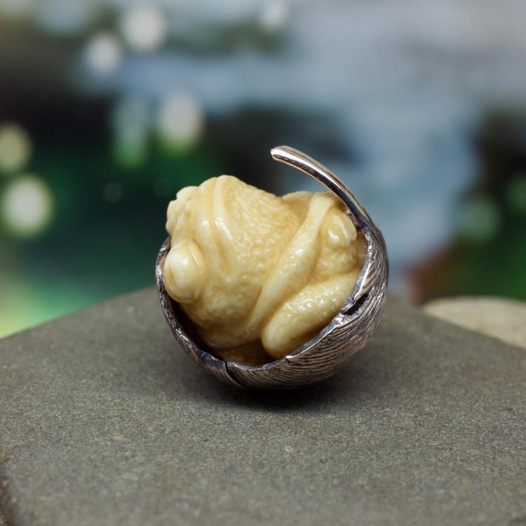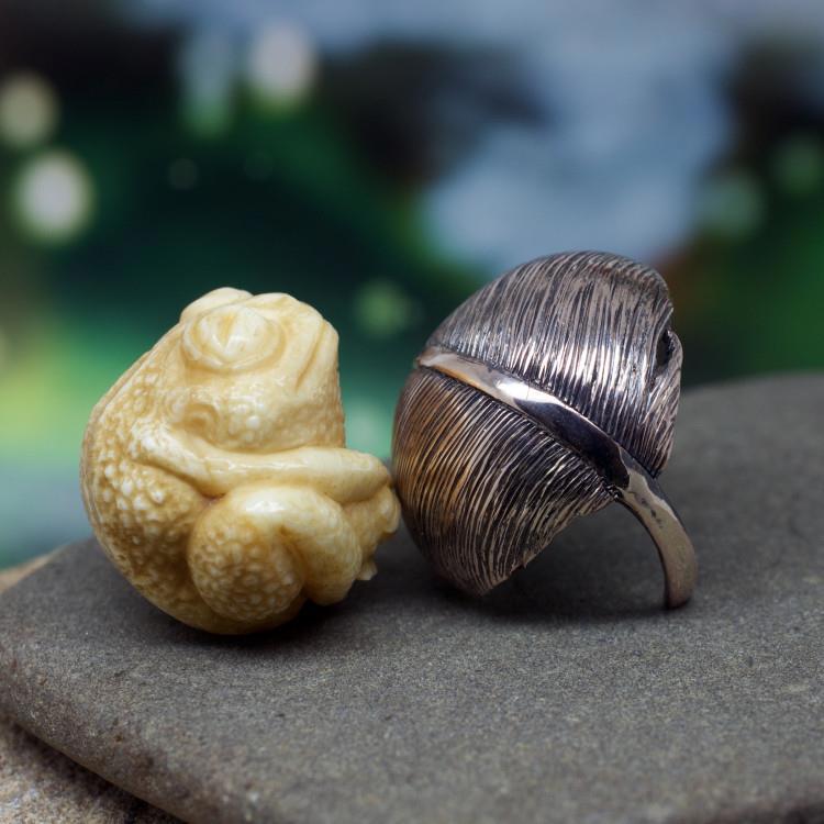 Лягушонок вырезан из зуба кашалота, перо выковано и гравировано вручную из розового медно-серебряного сплава.