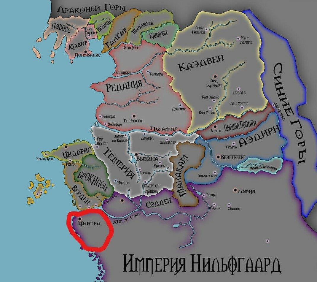 Взгляните на северо-восточную часть Каэдвена. Там есть такая ма-аленькая точечка под названием «Каэр Морхэн». А теперь переведите взгляд на юго-запад. Там кружочком обведена «Цинтра». Так вот, в последних сериях они туда и обратно бегали с такой скоростью, что складывалось ощущение, будто бы до замка ведьмаков ездит Сапсан.