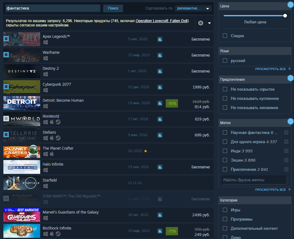Допустим, я открываю Стим, вбиваю в поисковик «Фантастика». Вверху мне выводит Киберпанк, Стелларис, Дейтройт, Биошок — определённо качественные вещи по геймплею (а от сюжета Киберпанка я до сих пор в приятном послевкусии — ни одна книга, прочитанная за последние пару лет, не могла таким похвастать). В самом топе многопользовательские Апекс и Варфрейм, но можно не сомневаться, что для своего жанра это вещи, в которых прилизан каждый сантиметр, как минимум, по визуалу. По балансу не могу судить, так как почти не играл в них.