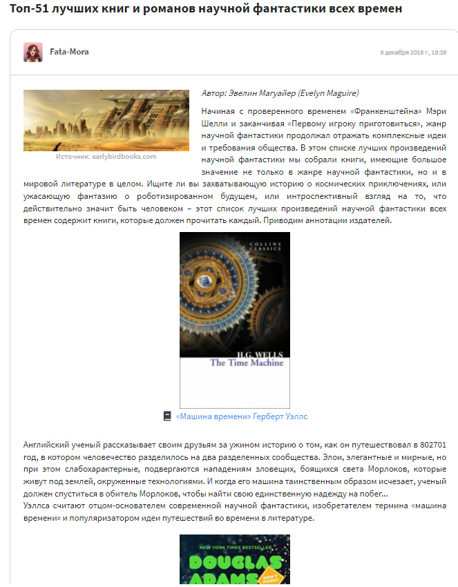 Далее: книги. Если я начинаю специально искать топ по классике фантастики, то нахожу не вызывающие вопросов Машину времени, 451 градус, Автостопом по галактике и т.д..