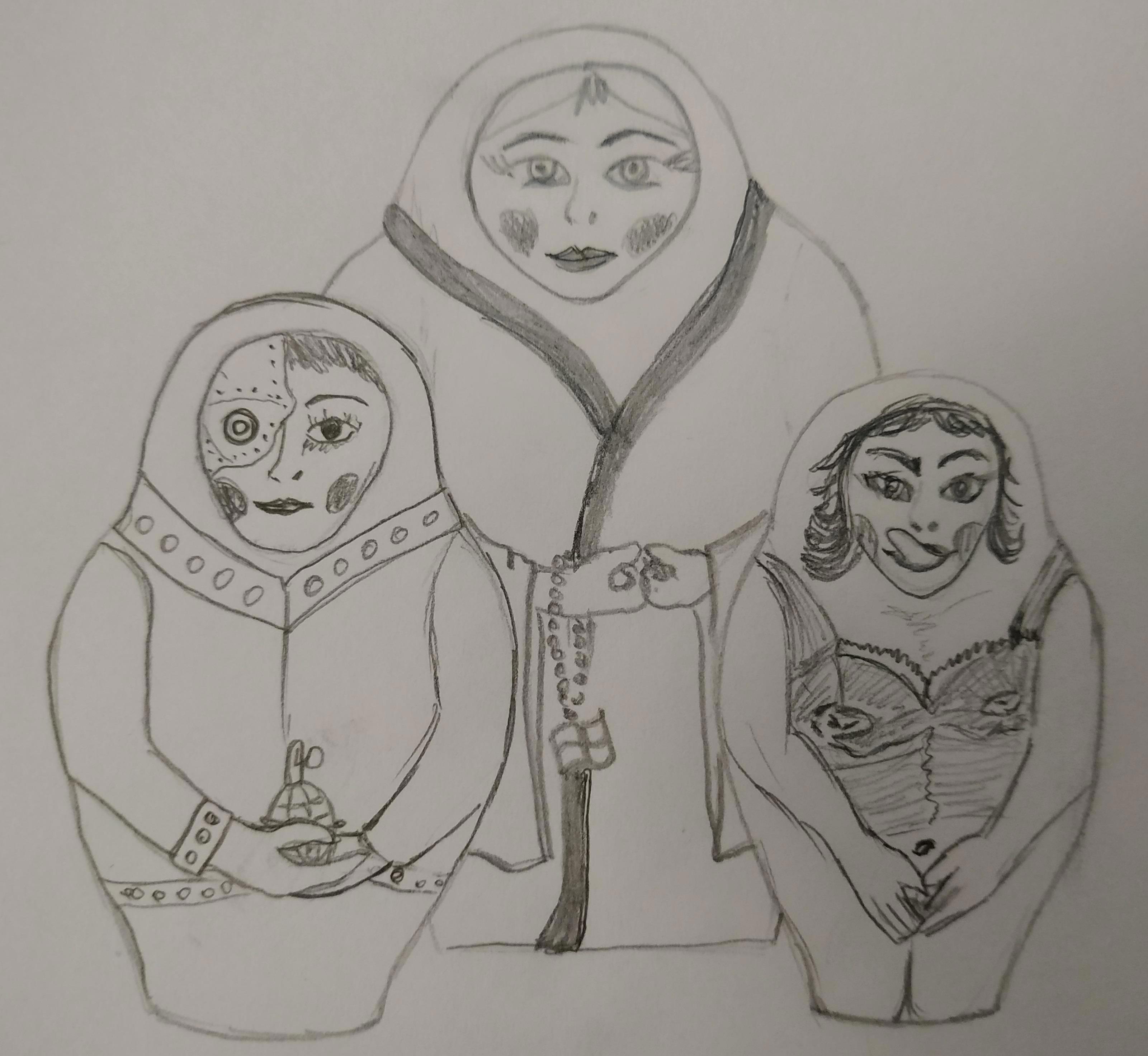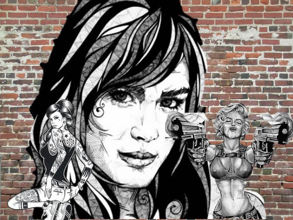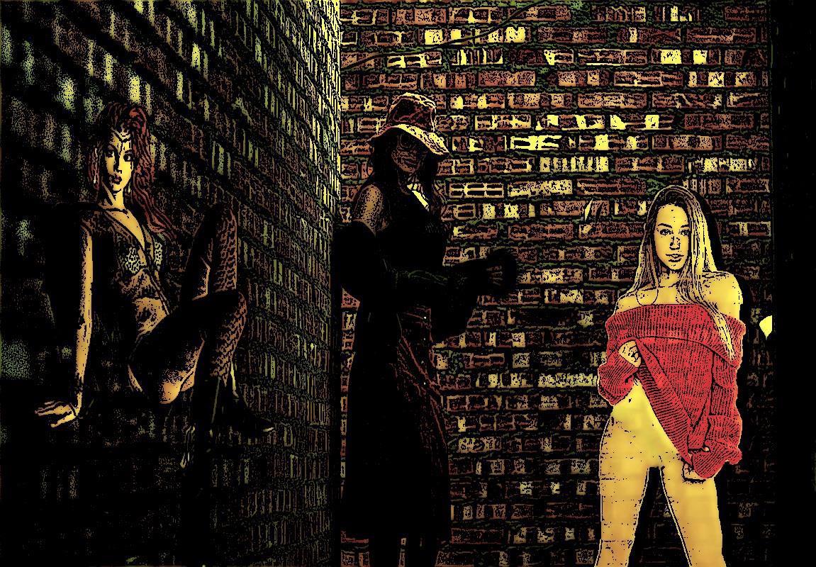 Две девчонки-подростка замерли, глядя точно на зрителя. Одна стояла, подбоченясь, со снайперской винтовкой в руках (оптический прицел почему-то был разбит), другая в непристойной позе застыла рядом, задрав подол. Белья под юбкой, конечно же, не было... А за спинами странной парочки замерла ехидно ухмыляющаяся девушка постарше. Все трое были одеты в платья, у всех троих были длинные волосы, и в чертах угадывалось едва уловимое сходство. Но в целом красивое граффити производило удивительно отталкивающее гнетущее впечатление