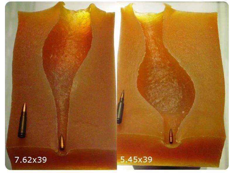 Как военный врач знаю,что 5,45 оставляет жуткие ранения. Траектория в теле не всегла предсказуема-при попадании в более плотную,чем мышцы,кость может изменить направление движения,а из-за кувыркания пули в раневом канале образуется,,фарш".7,62 более гуманная,раневой канал прямолинейный,зона,,молекулярного сотрясения"(разрушения тканей от гидродинамического удара,необходимую убирать при первичной хирургической обработке)много меньше. И болевой шок от 5,45 более значительный. Раньше 5,45 по незнанию называли,,пуля со смещенным центром тяжести",но это ошибочно,просто поражающие свойства пули так сильно отличаются от 7,62.