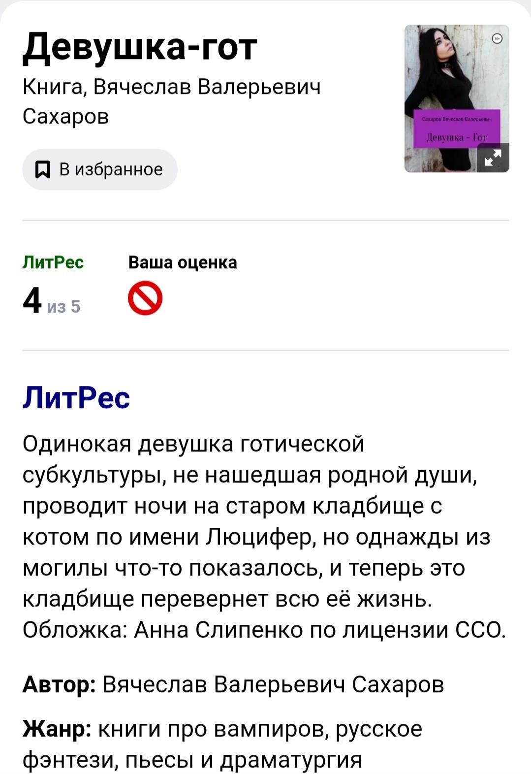 Автор: Вячеслав Валерьевич Сахаровhttps://www.litres.ru/vyacheslav-saharov/devushka-got/?lfrom=898158487&ref_offer=1&ref_key=827cbb5cbb246027a1cf622895432251cf08a6836c388cb701c156bf89b024fa
