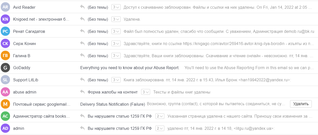 На основании вышеизложенного, прошу вас удалить мои произведения со своего портала. В противном случае, я буду вынужден подать жалобу о нарушении авторских прав в Роскомнадзор, а также в службы поддержки поисковых систем Яндекс, Google.