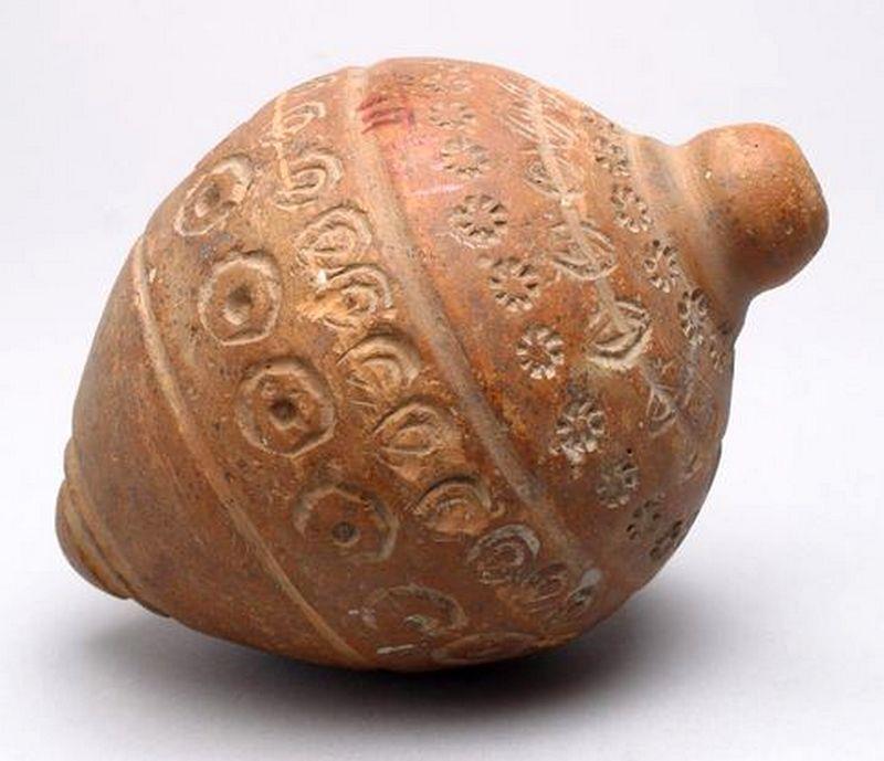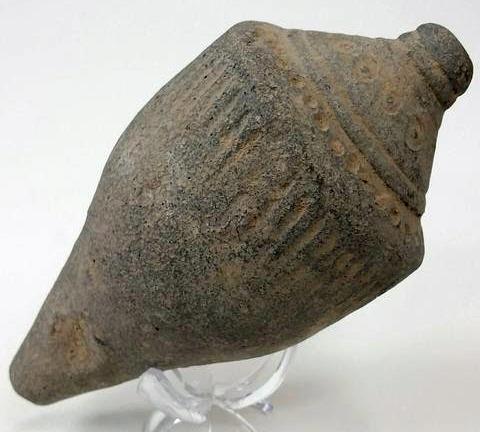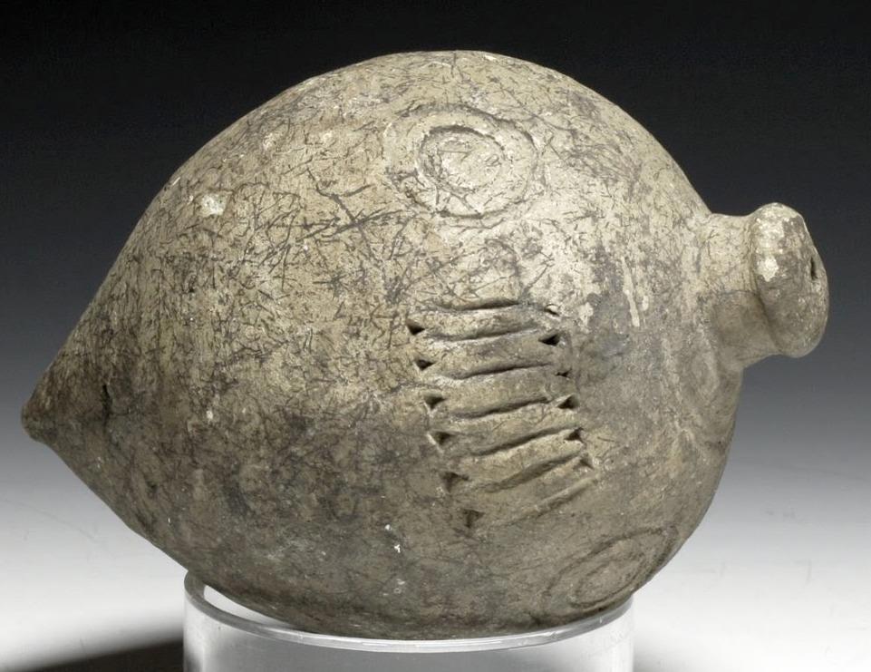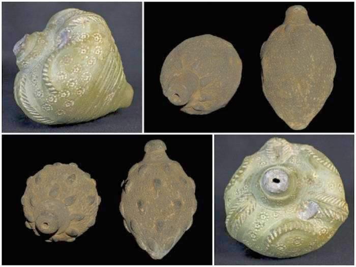 Да, да… эти самые – три сереньких округлых горшочка в центре и ещё один разбитый. В пояснениях чаще всего можно прочитать, что это сосуды для перевозки ртути. Вполне логично вообще-то. Горшочки невзрачные чаще всего, без особых украшений. Хотя встречаются образцы более отработанные, как вот такой, со следами глазури: