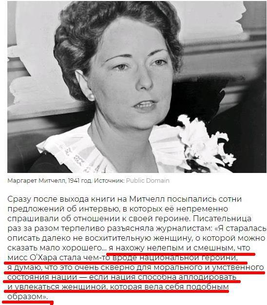 Вот только моральный облик Скарлетт там вышел такой, что сама автор отнекивалась от подражания героине. Мол, не воспринимайте всерьёз и тем более не пытайтесь понять, простить, а уж чтобы подражать Скарлетт и не вздумайте! Слова Маргарет на скрине:
