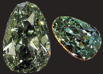 Занимают следующее место по редкости после красных алмазов. Своему окрасу зеленые алмазы обязаны не примесям, а воздействию жесткого ионизирующего излучения в процессе кристаллизации. В следствии такого воздействия алмазы начинают поглощать пурпурные лучи света и отражать зеленые.