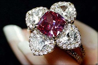 Graff’s Purplish Red Diamond (Графф Пурпурно-Красный, 2,26 карата) с необычной восьмиугольной огранкой, оправленный в кольцо в виде четырехлепесткового цветка, инкрустированного бесцветными бриллиантами – на четвертом месте среди красных бриллиантов.