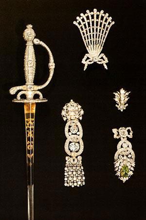 Предметы из бриллиантового гарнитура.Шпага, аксельбант с «Саксонским Белым» бриллиантом весом 48,71 карата («Дрезденский Белый», или Белый саксонский бриллиант в 48,71 карат и единственный в своем роде сапфир в 648 карат были подарены Петром I), аграф для шляпы с бриллиантом «Дрезденский зеленый».
