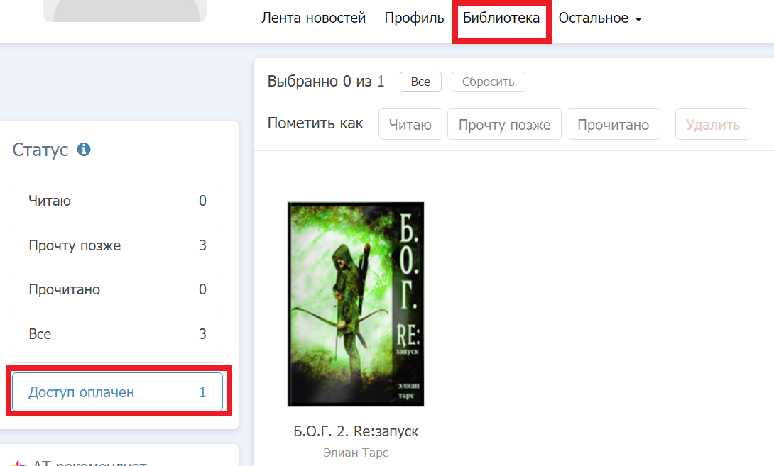 Что это значит? Лишь то, что на АТ у моих книг в ближайшее время точно не будет новых читателей. Что делать тем, кто потратил деньги и приобрел мои книги на АТ? Ничего – книги не удаляются, а снимаются с публикации. Таким образом для всех, кто ранее оплатил доступ, этот доступ сохраняется. Для всех остальных книги будут «невидимыми». Чтобы прочитать скрытую книгу, к которой у вас оплачен доступ, выберите в разделе «Библиотека» строчку «Доступ оплачен» (как на картинке):
