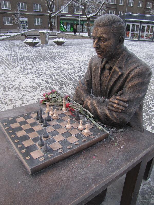 Гроссмейстер Пауль Керес играет одну из своих последних партий. Только он ее выиграл черными, а скульптор изваял, что Керес проиграл белыми. Пришлось доску поворачивать, теперь в Нарве все правильно.
