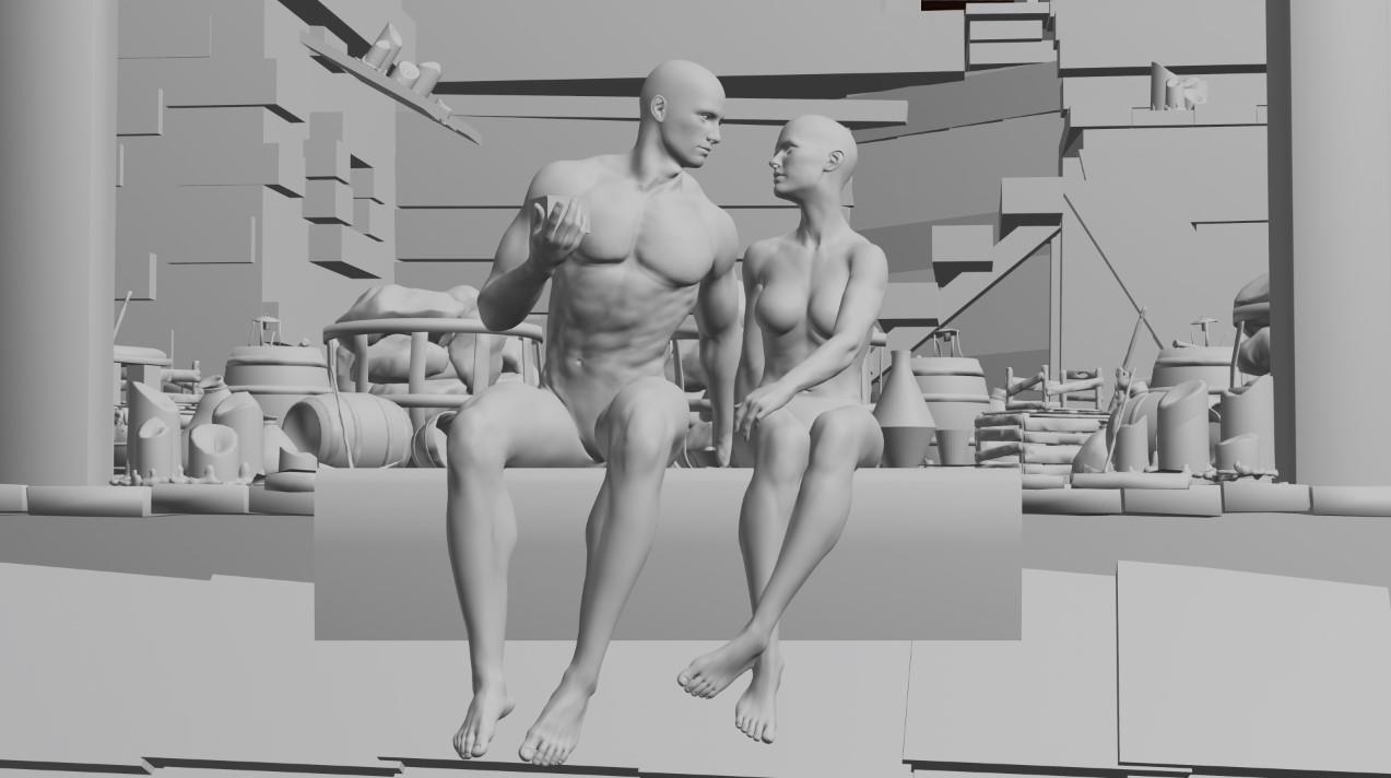 Так как сцена планировалась быть детализированной, мы с заказчиком сразу же определили основные рефы и положение персонажей на листе. Как только общий набросок был утвержден, я перехожу к проработке света и объектов в Blender. Последнее время большие сцены рисую исключительно на базе него. Во-первых, с исходной 3d моделью можно не мучиться со светопередачей. Во-вторых, это невероятно сильно уменьшает время и трудозатраты для дальнейшего процесса.