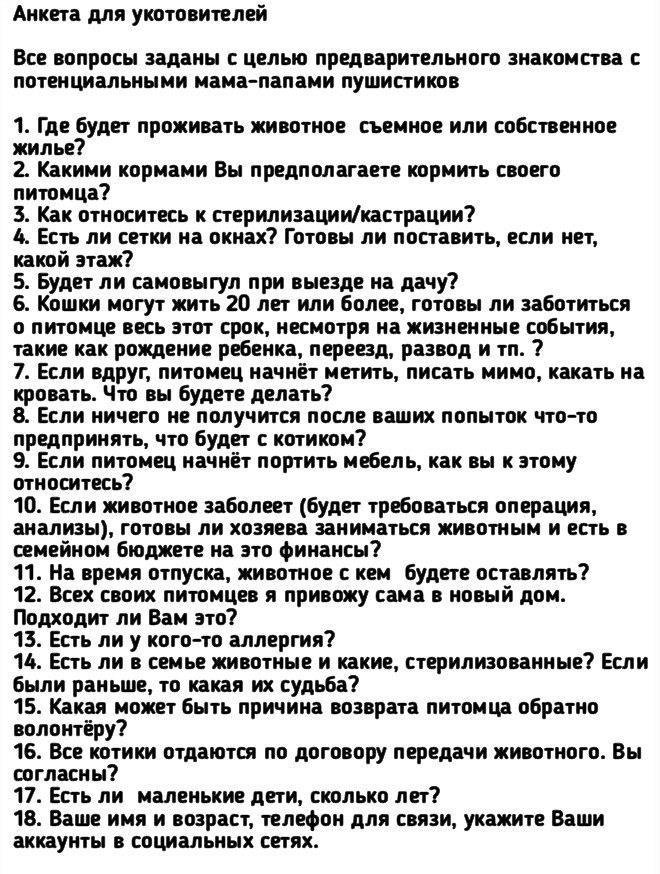 Автор: Такеши О'рубиДоброго. Решили тут с женой приобрести котика. Пушистого, вежливого, воспитанного, а главное - чтобы пользу приносил! Можно не материальную, но хотя бы присутствием радовал. Не так уж и долго лазили по различным площадкам, нашли. Серого цвета с белыми вкраплениями на мордочке и лапках. Собственник, представляющий интересы котика назвался волонтером и предварительно сбросил на заполнение вот такую анкету!