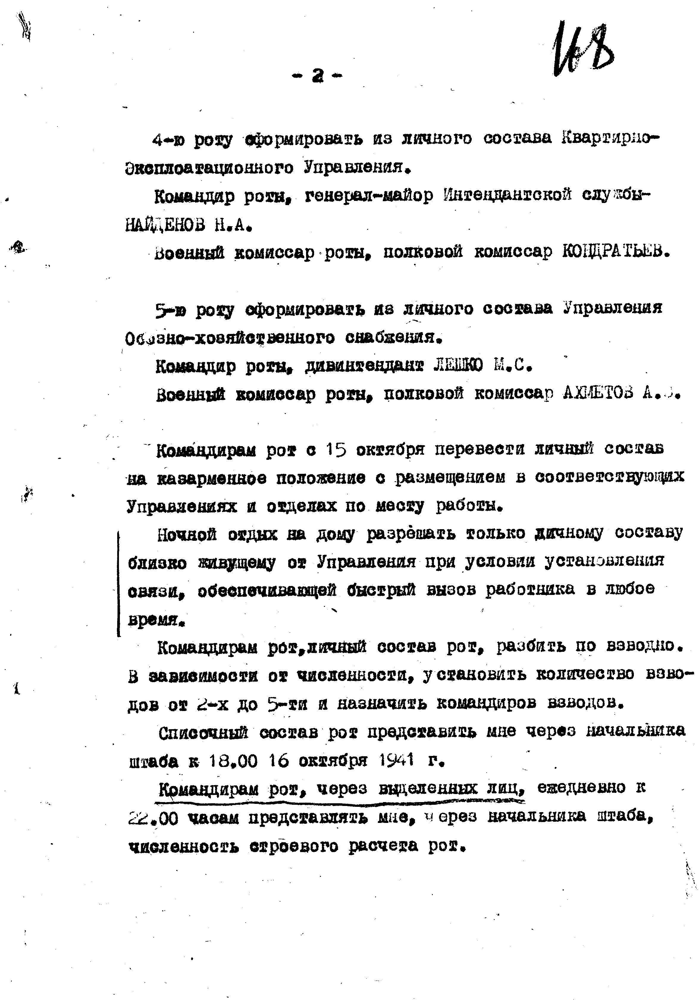 Враг рвется к Москве. Все, кто может держать в руках оружие, готовятся до последнего вздоха защищать столицу. Из остающегося личного состава Главного Интендантского управления формируется стрелковый батальон 5 ротного состава. Первая рота – из личного состава Управления Главного Интенданта, Технического комитета и отдела кадров, вторая – личный состав Управления Вещевого снабжения, третья – Управление Продовольственного снабжения, четвертая – Квартирно-эксплуатационное управление, пятая – Управление обозно-хозяйственного снабжения. Командиры стрелковых рот – начальники Управлений, комбат – Главный Интендант Красной Армии, генерал-майор П.Д. Давыдов.