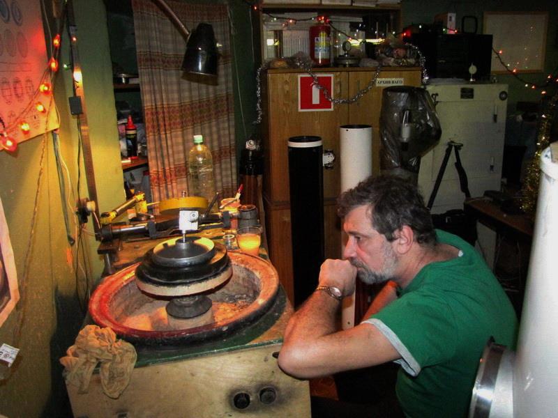 Пред уходом из нашего подвала он подарил мне ситалловую заготовку, и я сделал из нее зеркало для телескопа, который сейчас мне служит. Нашел в архивах фото: самодельный станочек трет ситалл, а я медитирую. Мне куда проще, чем моему тезке. Зато я так и останусь приземленным, а он, видимо, полетит.