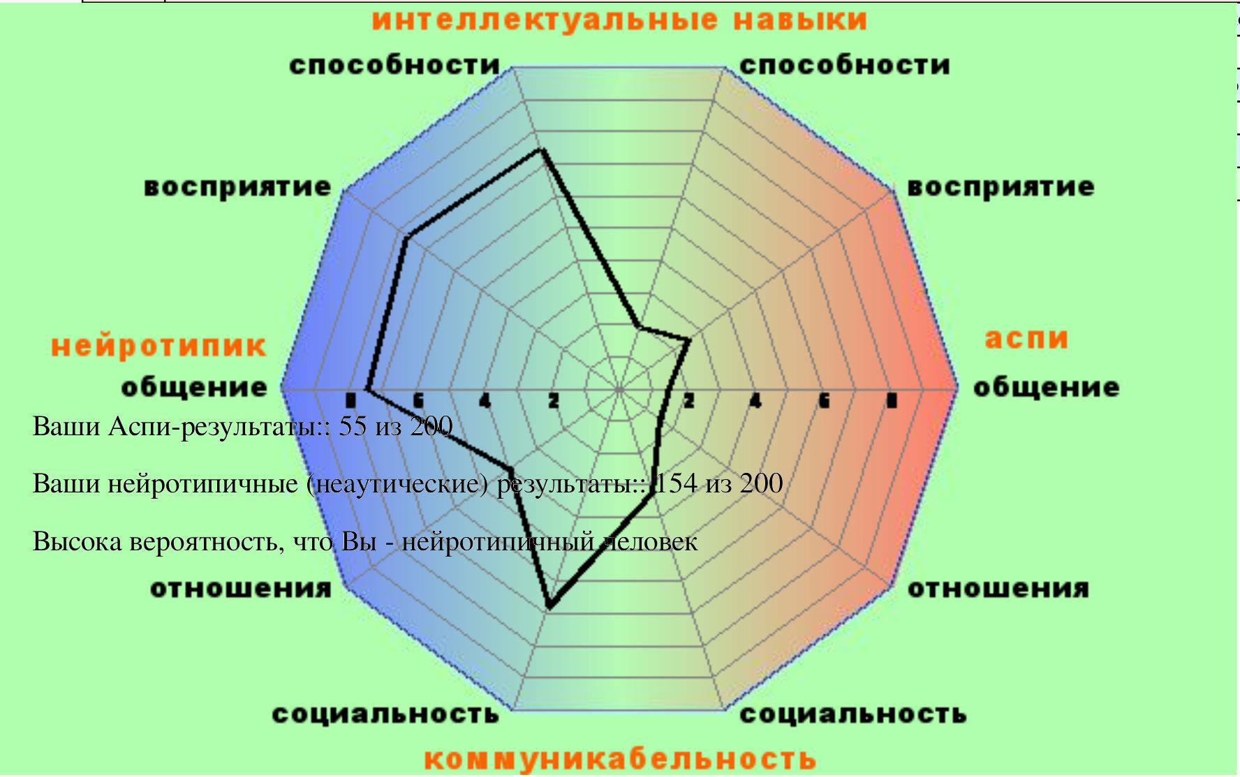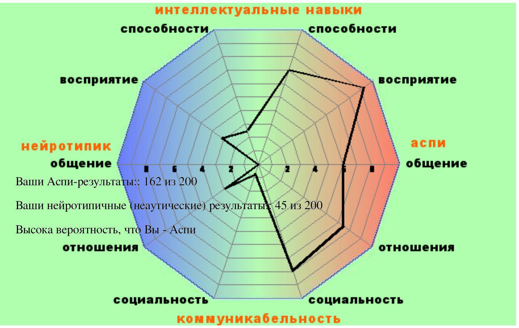 Одна знакомая, толи для тренировки, толи ещё зачемто втихаря задавала вопросы из так называемого «психологического теста на синдром Аспергера». Про саму психологию помолчим, их функцию раньше выполняли священники-духовники, в языческие времена — гадатели, а в нынешние времена атеизма просто создали профессию, а поскольку она прибыльная — естественно ей выгодно пугать увеличивая свою значимость, но это нормально, так все делают — от сантехника до глав государств.
