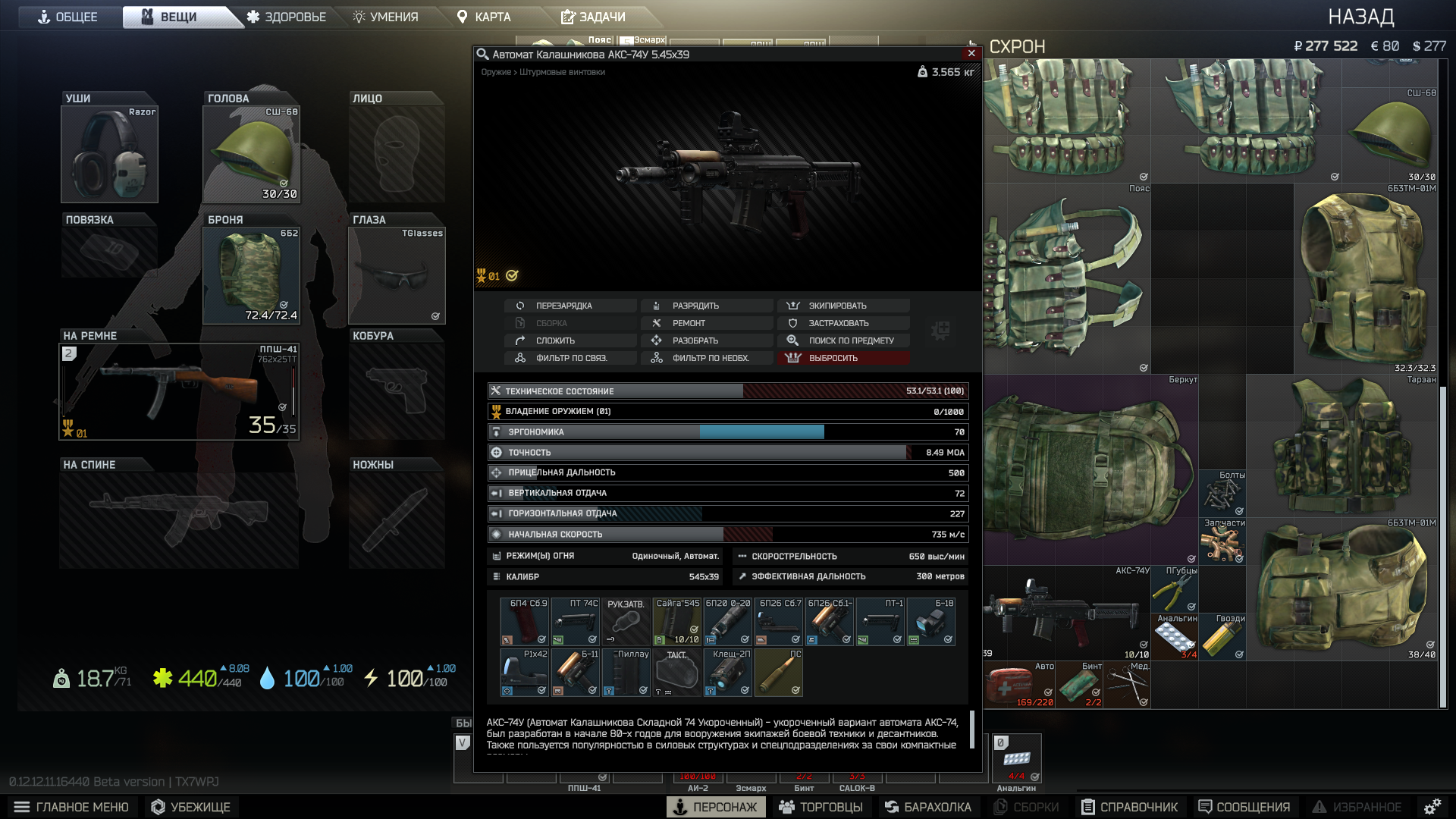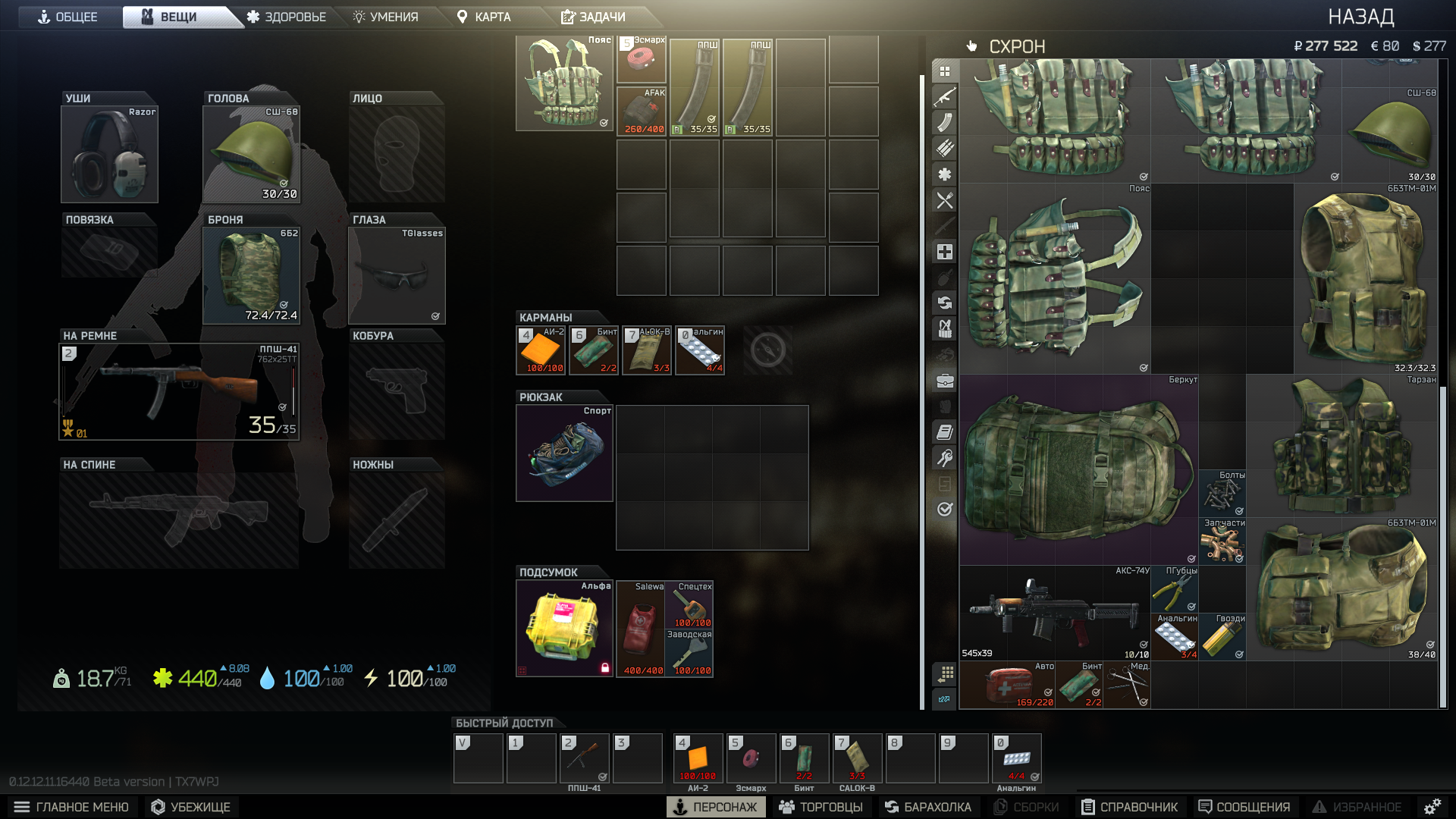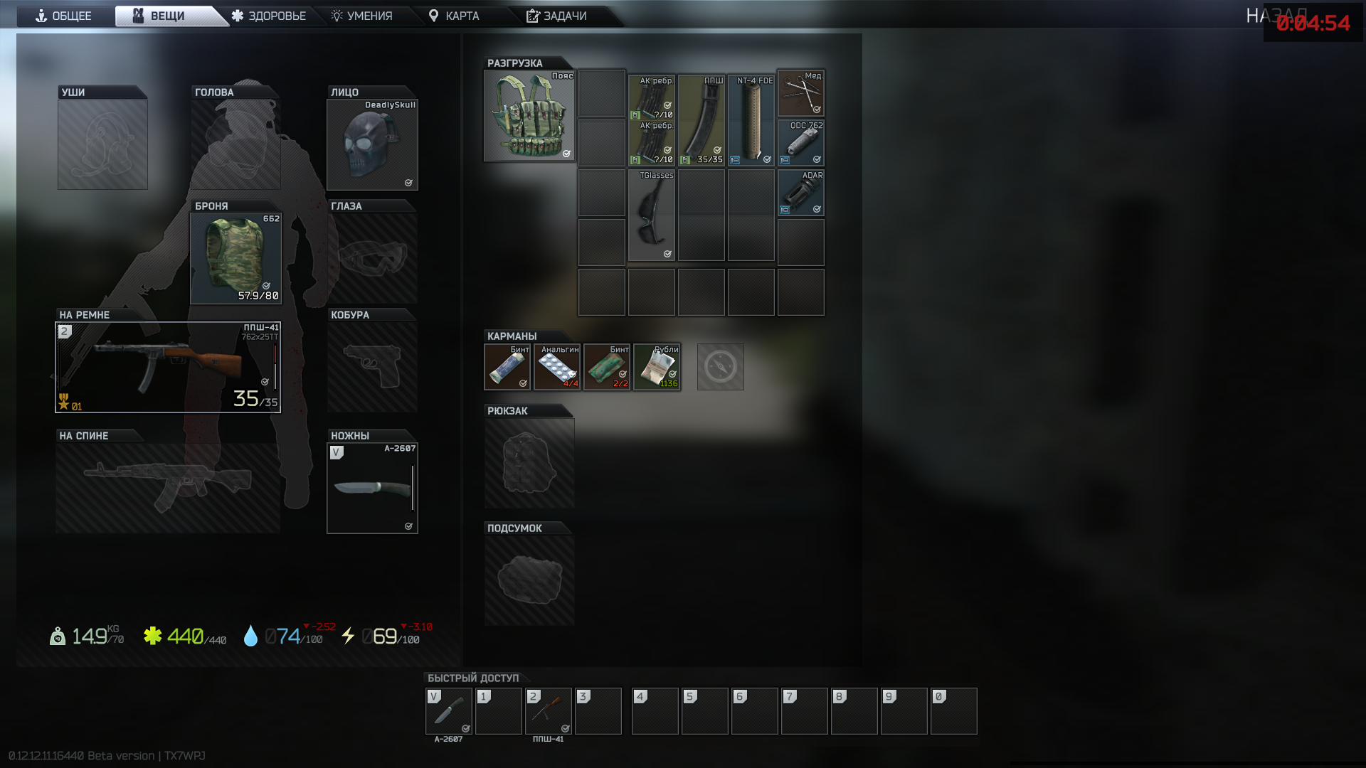 Вот это мой хабар с последней вылазки. Как можно заметить, пока лутала очередной труп игрока, забыла переложить рюкзак. Все моё добро осталось на теле. Зато я нашла хорошую разгрузку, ППШ, крепкую броню и маску. Все это добро перешло к моему персонажу.