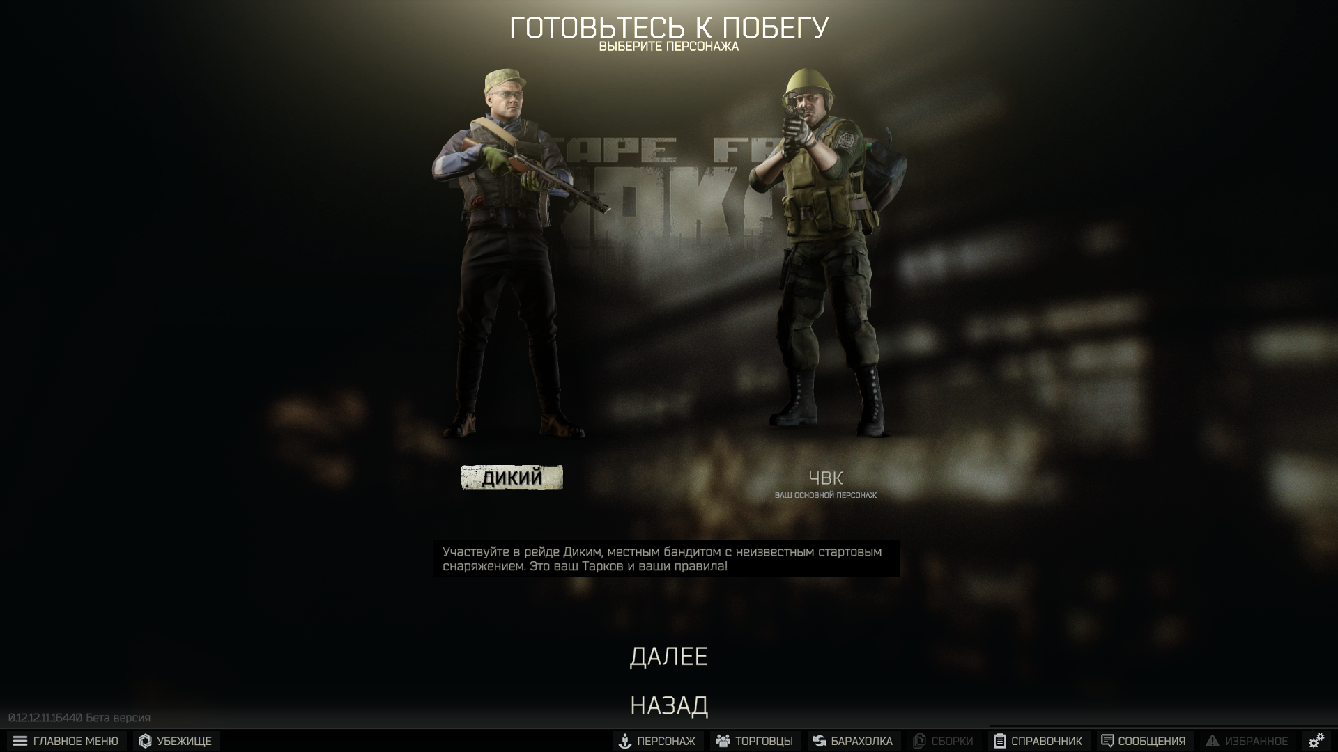 Вот это окошко выбора персонажа спасало меня много раз. И если в случае с основным персонажем, ЧВК, дела обстояли очень плохо, то вот Дикий помог мне подняться с самого дна и получить хоть какие-то шансы на освоение игры.