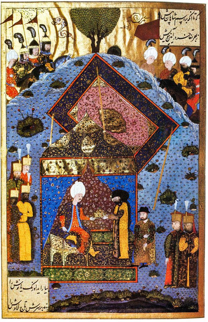 Сулейман Великолепный передаёт королевскую корону Яношу Запойяи. Турецкая миниатюра XVI века.
