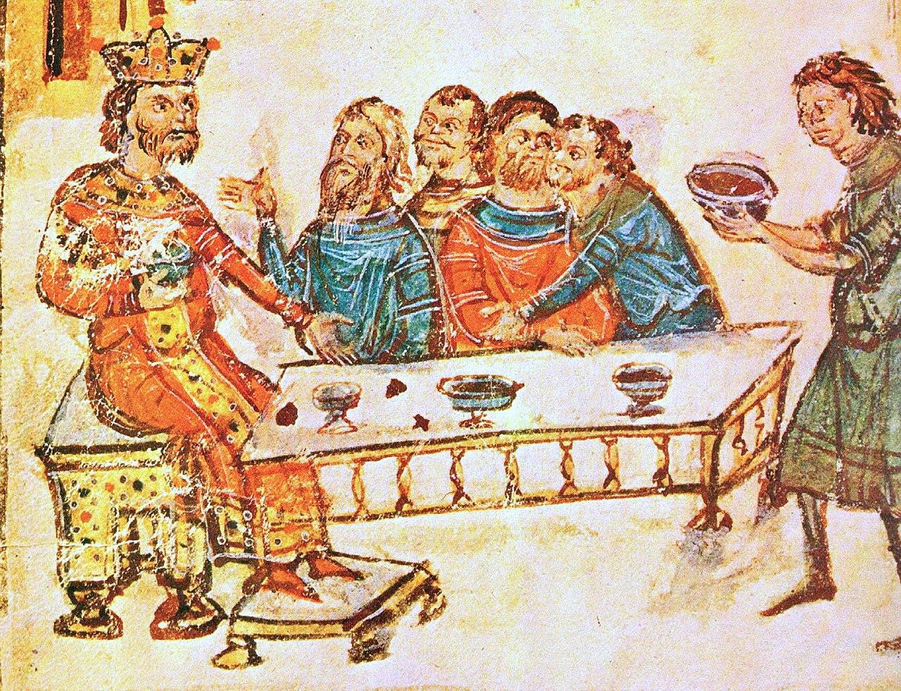 Хан Крум с приближёнными. Круму подносят чашу с вином, сделанную из черепа византийского императора Никифора I. Миниатюра из летописи XIV века.