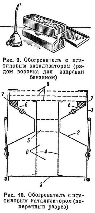 Ещё интереснее подогреватели, которые не использовали открытое горение. Это беспламенные каталитические обогреватели. Их действие было основано на химической реакции паров бензина, которые проходили через раскалённый катализатор. Он представлял собой асбестовую вату, пропитанную солями хлорной платины или солями окиси меди и хрома. Их часто называли «платиновыми». Вот такой подогреватель под названием «Промотор»: