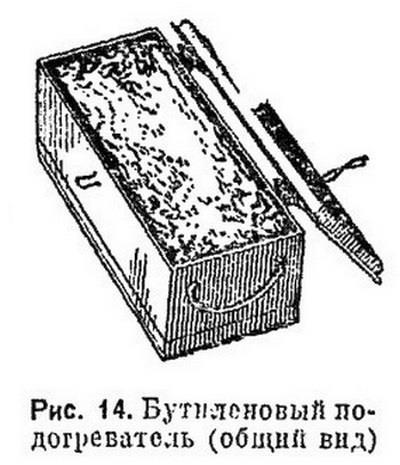 Весил такой 11 кг. Работал на бензине, но для розжига нужен был спирт. Температура у поверхности горелки до 400 градусов. Продолжительность работы на одной заправке больше суток. ОМТ (обогреватель малый танковый) весил всего 6 кг, при этом остальные характеристики у него были не сильно ниже. Эти устройства интереснее других, потому что они работали незаметно. Ни огня, ни искр, ни даже дыма. Если всё делать правильно, то безопасная штука. Для определения начала работы в инструкции предлагалось пощупать его рукой. В них была предусмотрена также регулировка интенсивности работы. То есть количество производимого тепла можно было регулировать. К таким же устройствам относятся «бутиленовые подогреватели»: