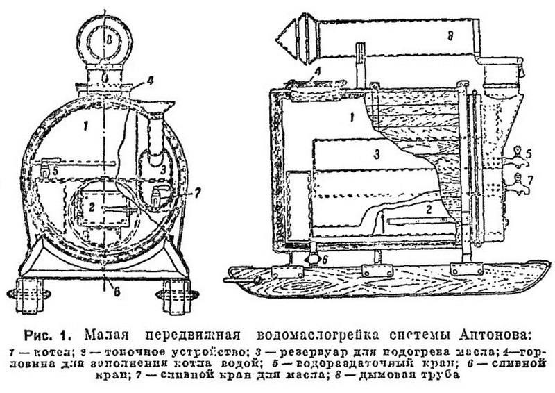 Круто, но пригодно, если есть железная дорога и крупное подразделение. Если этого нет, то есть водомаслогрейка Антонова для тех же целей, которая буксируется на санках. Её ёмкость – 0,4 кубометра. Небольшая, но мощная установка: