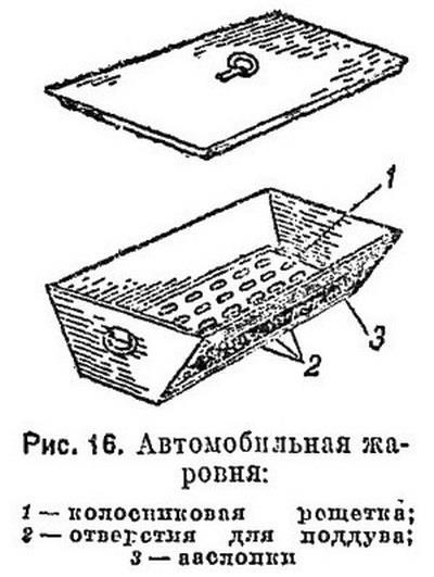 И даже углевые жаровни, которые использовали зимой для обогрева кабины в автомобилях, и которые также относят сейчас к «солдатской смекалке», были предусмотрены и выпускались в промышленных масштабах. Вот эта жаровня из справочника: