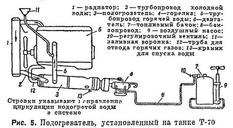 На лёгком танке Т-70 тоже не обогревали боевое отделение, но всё же была установлена собственная система подогрева двигателя для упрощения его запуска в мороз:
