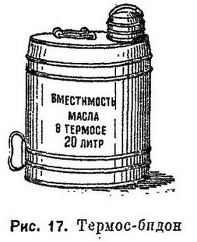 Понятно, что 1942 год не означает, что за проблему взялись уже во время войны. Такие бумаги в Красной Армии регулярно обновлялись. В документе сжато, но точно не только перечислили около десятка способов и приспособлений по прогреву двигателя в зимнее время, но и коротко описали конструкцию и способ применения. Начали с простейших способов – заливаем в двигатель горячую воду, антифриз, масло. Для этой цели были предусмотрены термосы: