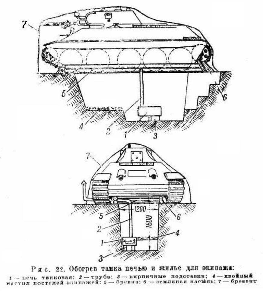 Всё очень логично и всё достаточно безопасно. Края брезента прижаты к земле, дымовая труба выведена в сторону. И тепло, и маскировка техники в одной конструкции. Таким способом в тепле оказывается не только экипаж, но и сам танк, а это важно, ведь его нужно в случае тревоги быстро завести. Всё продумано. Немного, правда, непонятно одно – причём здесь «солдатская смекалка», если это явно страница из инструкции? И эта картинка чётко свидетельствует о том, что об обогреве экипажа в полевых условиях всё же думали. Если не конструктора, то армейское командование.